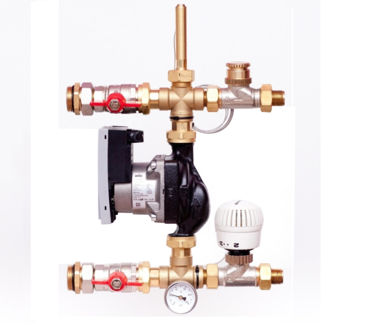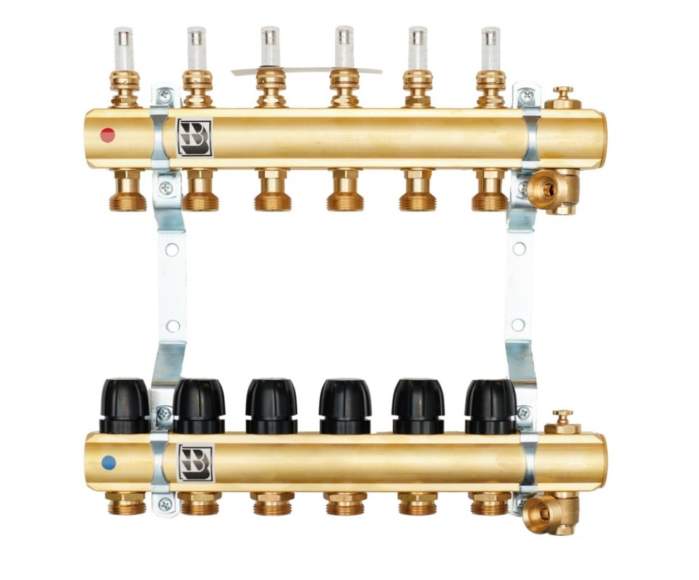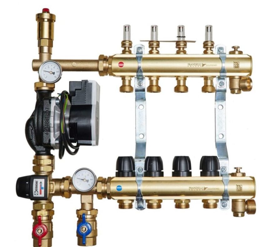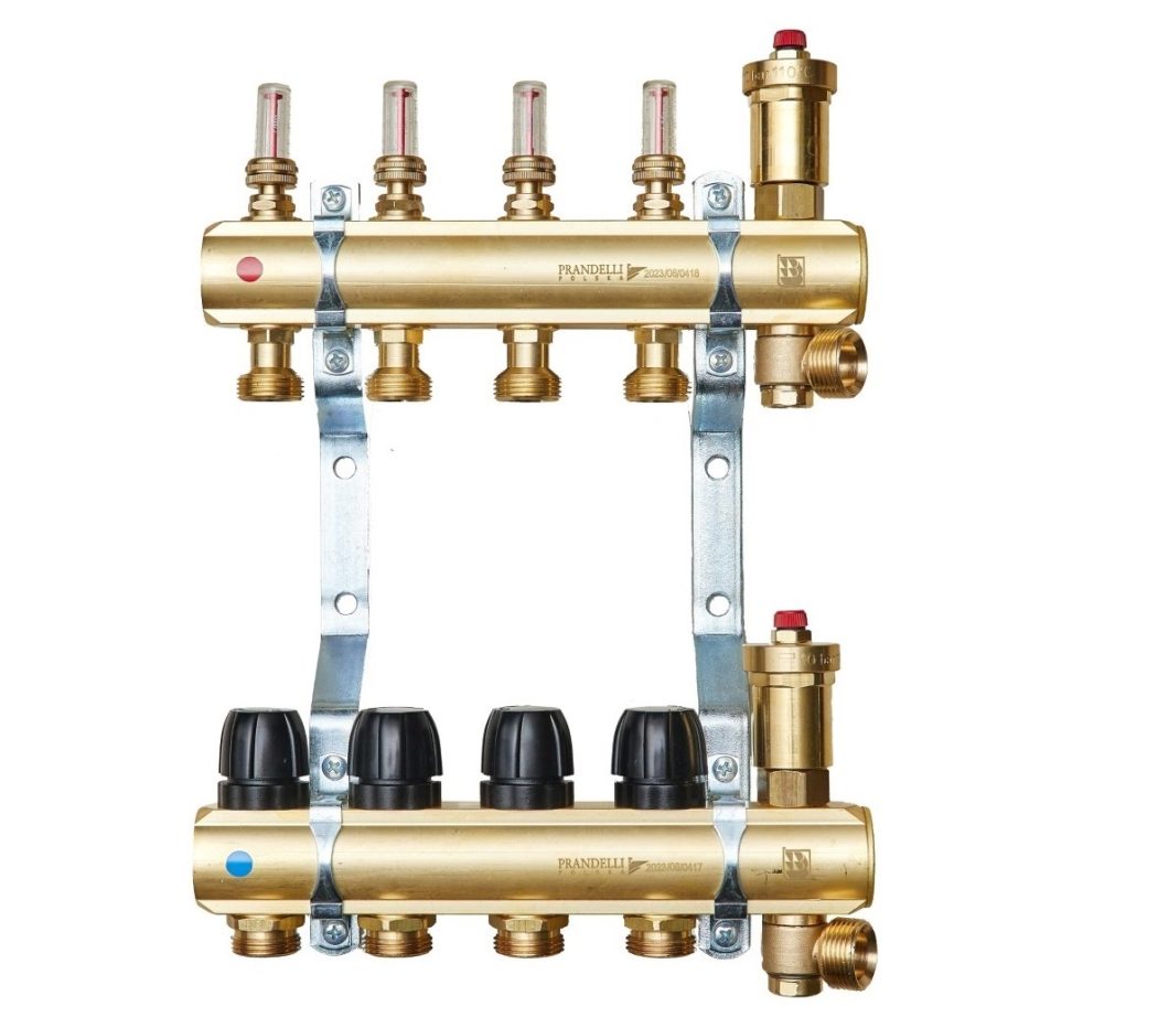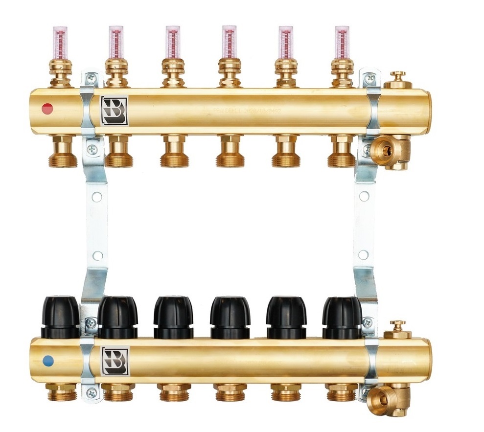 Rozdzielacze mosiężne oraz zestawy pompowe do ogrzewania podłogowego z rotametrami magnetycznymi