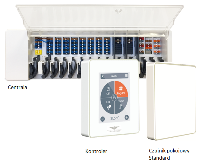 Wówczas, gdy zależy nam tylko na grzaniu i sterowaniu naszym układem przez kontroler , wystarczy Kontroler Standard (MC008) i czujniki pokojowe (Standard lub 55m do wbudowania w ramki np. Berker).