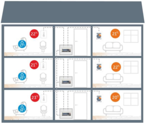 W obiekcie do 12 pomieszczeń wystarczy zastosować jeden kontroler w pomieszczeniu głównym, a w pozostałych tańsze czujki pokojowe. Możemy oczywiście zastosować więcej kontrolerów w jednym układzie np. gdy chcemy mieć na każdym poziomie element z dotykowym wyświetlaczem 2,8” do zmiany ustawień w wybranych pomieszczeniach.