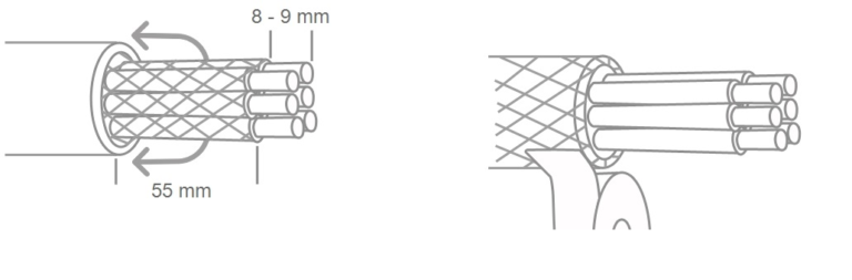 Komunikacja Centrali z innymi elementami sterowania odbywa się przez magistralę CAN z bezpiecznym prądem 24V i 5V. Z tego też powodu do połączeń w magistrali najlepsze będą ekranowane przewody FTP czyli skrętka internetowa. Ekran będzie pełnił funkcję przewodu ochronnego. Podłączamy go do złącza PE w jednej z centralek. Przygotowanie przewodu do podłączenia polega na zdjęciu 55m zewnętrznej izolacji przewodu FTP i odizolowanie 8-9mm każdej żyły.
