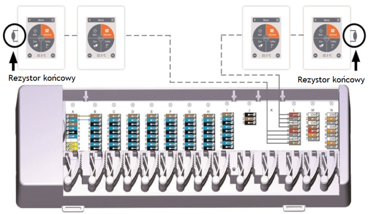 Podkreślić należy, że kontrolery podłączone są czterema żyłami, a pozostałe elementy trzema odrębnymi (skrętka ma 8 żył co pozwala na tworzenie dwóch niezależnych magistrali danych).