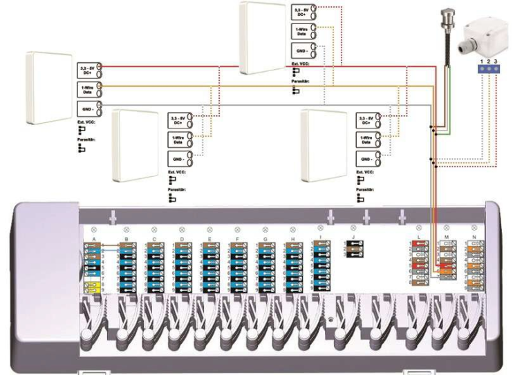 Do trzyżyłowej magistrali czujek temperatury w pomieszczeniu podpiąć możemy także szeregowo (zalecane ) lub równolegle czujki :
