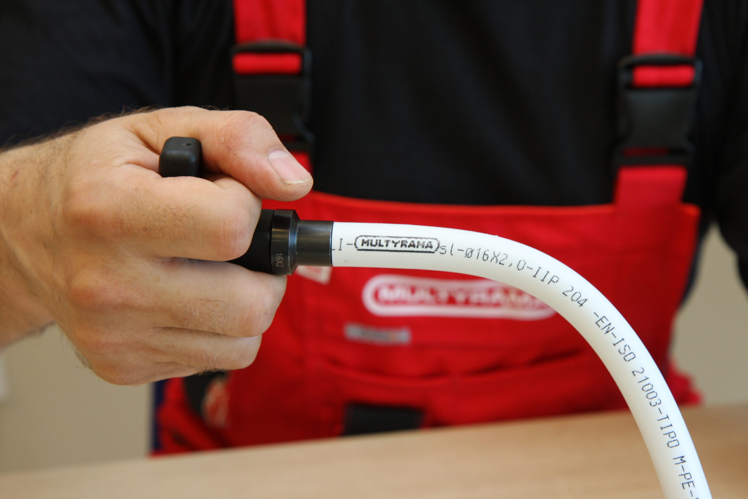 Sprawdzamy, czy pod tulejką zaciskową nie ma przypadkowych zabrudzeń, a następnie wsuwamy rurę w złączkę do momentu ukazania się rury w otworze kontrolnym.