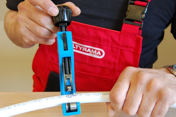 Kalibrujemy przeciętą rurę przy pomocy specjalnego narzędzia, które umieszczamy w rurze obracając zgodnie z ruchem wskazówek zegara aż do osiągnięcia sfazowania otworu. Przed następnym etapem prac należy sprawdzić, czy wewnątrz rury nie znajdują się pozostałości po przeprowadzonej operacji, takie jak wiórki materiału lub inne zabrudzenia.